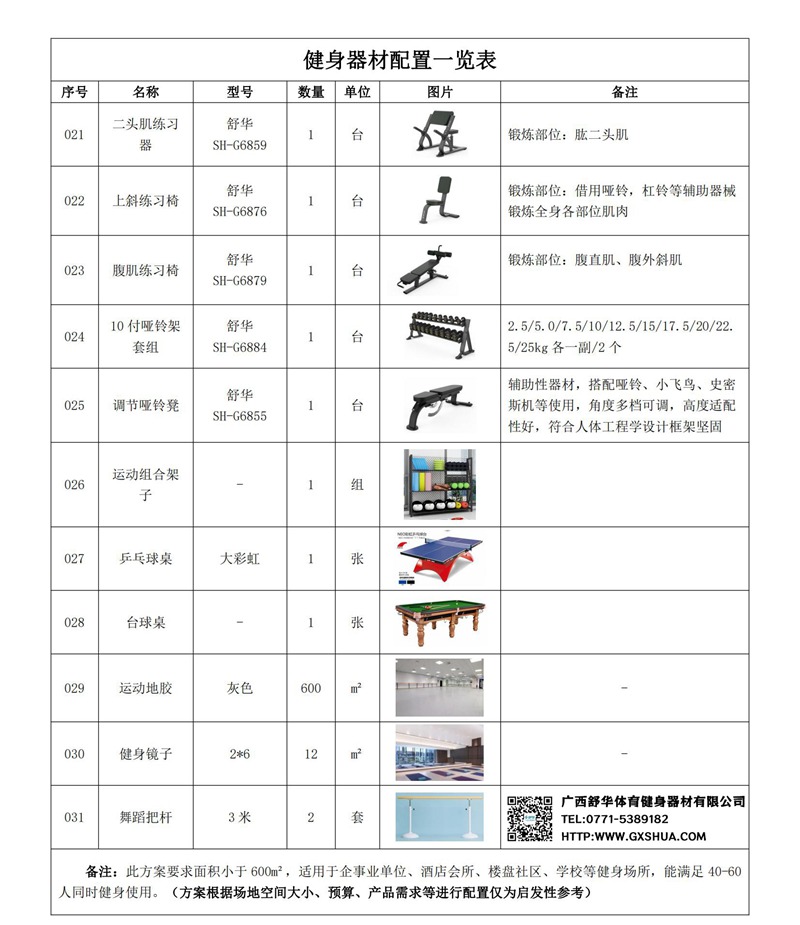 此方案要求面积小于600m²,适用于企事业单位、酒店会所、楼盘社区、学校、商用健身房等健身场所,能满足40-60人同时健身使用。(方案根据场地空间大小、预算、产品需求等进行配置仅为启发性参考)